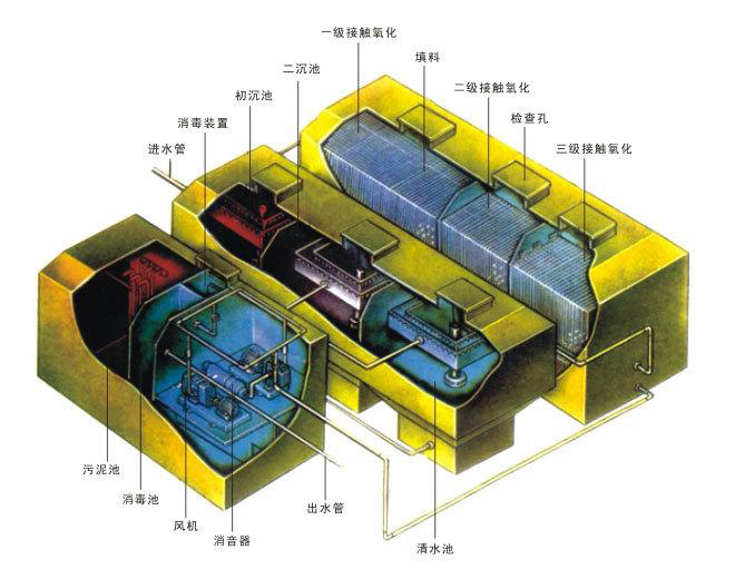 7、生化池采用生物接觸氧化法,其填料的體積負荷比較低,微生物處于自身氧化階斷,產(chǎn)泥量少,僅需3十月以上排 一次泥(用糞車抽吸或脫水成泥餅外運)。