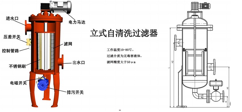 自清洗過濾器是在水處理行業(yè)應用比較廣泛的設備,其簡單的設計以及良好的性能使污水達到最佳的過濾效果。主要組件有:電機、電控箱、控制管路、主管組件、濾芯組件、不銹鋼刷、框架組件、傳動軸、進出口連接法蘭等。自清洗過濾器克服傳統過濾產品的納污量小、 易受污物堵塞、過濾部分需拆卸清洗且無法監(jiān)控過濾器狀態(tài)等眾多缺點,具有對原水進行過濾并自動對濾芯進行清洗排污的功能,且清洗排污時系統不間斷供水,可以監(jiān)控過濾器的工作狀態(tài),自動化程度很高。覆蓋了由10um到3000um的各種過濾精度的需求。