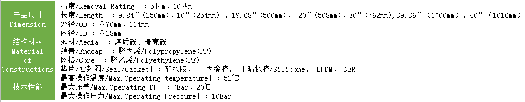 UDF活性炭濾芯系列采用高效活性炭細顆粒加食品級膠粉連續(xù)擠壓成型。該產(chǎn)品不僅具有顆?;钚蕴績?yōu)良的吸附性能,而且還可以避免散狀活性炭釋放碳粉的缺點,可以有效去除液體或氣體中的余氯、異味及有機物。濾芯較內層為聚丙烯骨架,用以加強濾芯的耐壓強度。骨架上包有兩層聚丙烯超細纖維氈,能截住液體通過碳芯而帶出大于10微米的顆粒。碳芯外層包有兩層聚丙烯超細纖維氈,能截住液體中大于10-20微米的顆粒,使濾芯具有過濾與凈化雙重功能。較外層為白色塑料網(wǎng)套,使濾芯具有完整的外表與整 潔的外觀。濾芯兩端裝有柔軟的丁睛橡膠端蓋,使濾芯裝入濾筒后具有良好的密封性。成品活性碳濾芯均用塑料薄膜嚴密包封,防止濾芯被污染并保持濾芯經(jīng)常處于清新狀態(tài)。