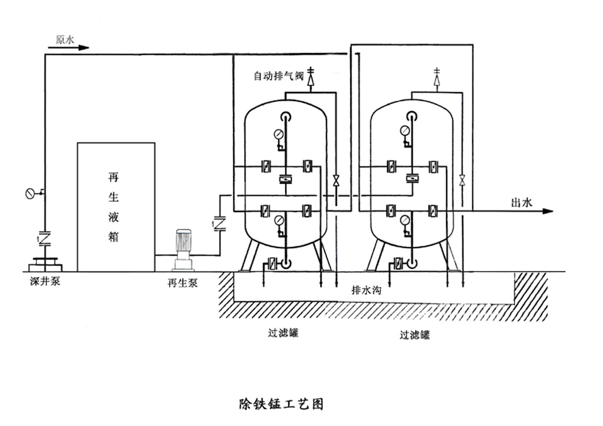 除鐵錳過濾器由曝氣裝置和錳砂過濾罐組成;利用氧化法將水中低價鐵離子和低價錳離子氧化成高價鐵離子和高價錳離子,再經(jīng)過吸咐過濾去除,降低水中鐵錳含量。