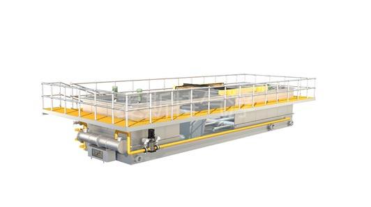 高效淺層氣浮系統(tǒng)是一個(gè)先進(jìn)的快速氣浮系統(tǒng),改傳統(tǒng)氣浮的靜態(tài)進(jìn)水、動(dòng)態(tài)出水為動(dòng)態(tài)進(jìn)水、靜態(tài)出水,即把含有附有微氣泡懸浮顆粒的混合污水進(jìn)入氣浮池內(nèi)的時(shí)候,使出流裝置移動(dòng),混合廢水的水平流速相對(duì)出流裝置為零,從而抑制了槽內(nèi)的紊流,因而能進(jìn)行平穩(wěn)的氣浮分離(即所謂的“零速度原理”),浮選體上升速度達(dá)到或接近理論升速,極大地提高了處理效率,使廢水在淺層氣浮槽中的停留時(shí)間由傳統(tǒng)的30~60 min減至3 min,并且集凝聚、撇渣、排水、排泥為一體,是一種高效的廢水處理裝置。